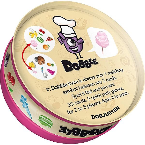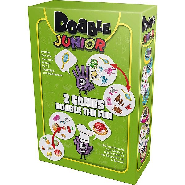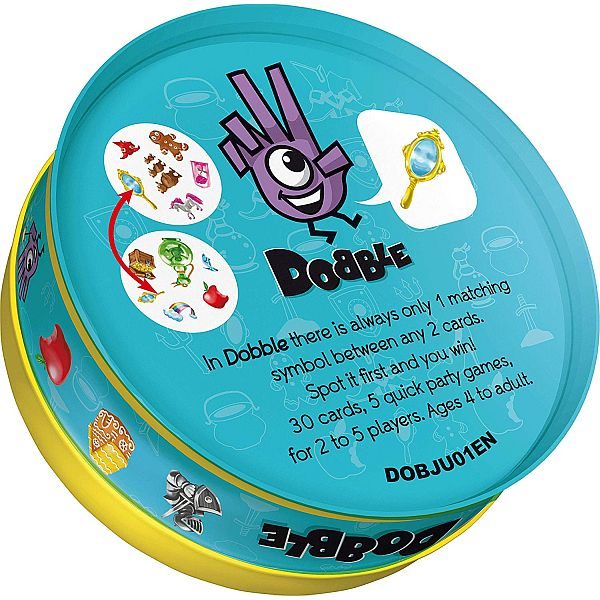 Dob: 4+, Igrača: 2-5, Partija: 10 min. Ovdje su bitni vaši refleksi i moć zapažanja – cilj je primjetiti karte sa istim simbolom i prebaciti ili uzeti si što više karata, prije protivnika. U jednom pakovanju dobijate 2 igre: Dobble Fantasia i Dobble Food.