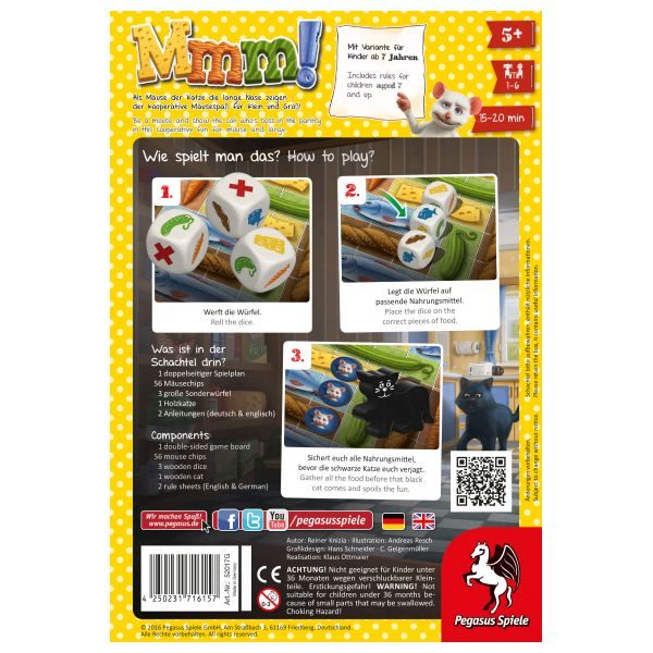 Dob: 5+, Igrača: 1-6, Partija: 15-20 min. Svi igrači su ovdje u ulozi miša i svi zajedno se igramo da probamo što prije pojesti što nam pripada u kuhinji, ali moramo paziti da nas crna mačka ne uhvati na djelu!