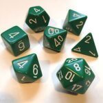 Set od 7 različitih dice (D4, D6, D8, D10, D12, D20, D100(D10 uvećani brojevi)).