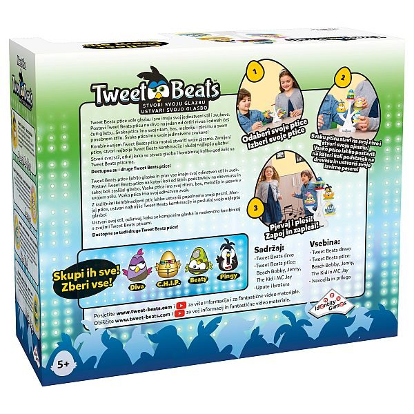 Ovaj set sadrži jedno zvučno drvo i 4 male Tweet Beat ptičice i zavisno na koju granu ih stavite, one proizvode različite zvukove sa svojim stilom! Možete praviti svoje kombinacije i napraviti novu pjesmu!